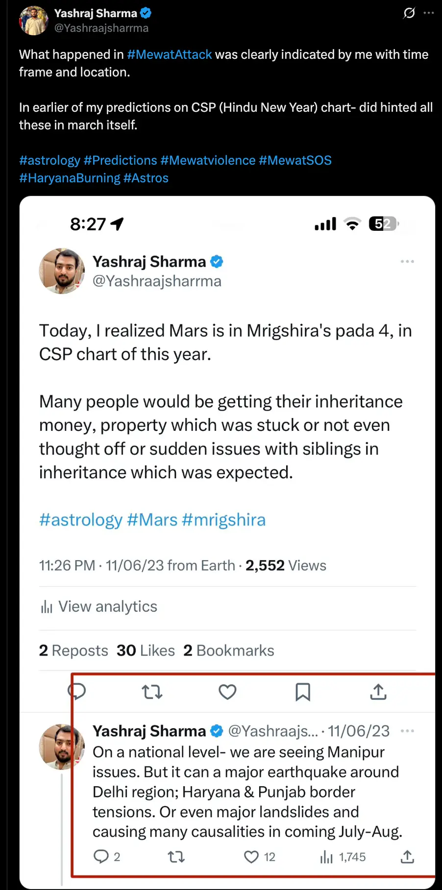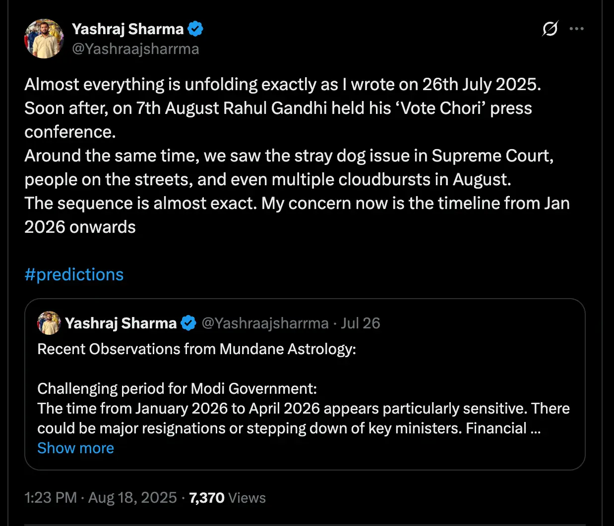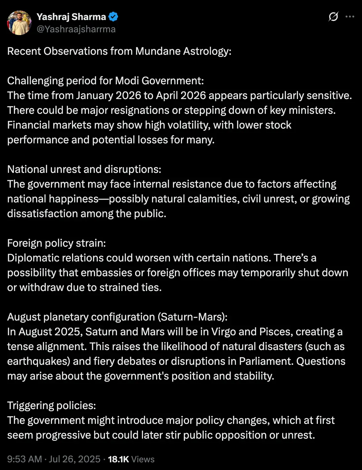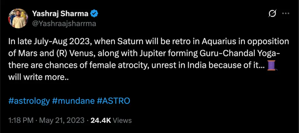 Predicted a major public unrest due to a female atrocity (Kolkata rape case from RG Kar Medical College). Here’s the post link.