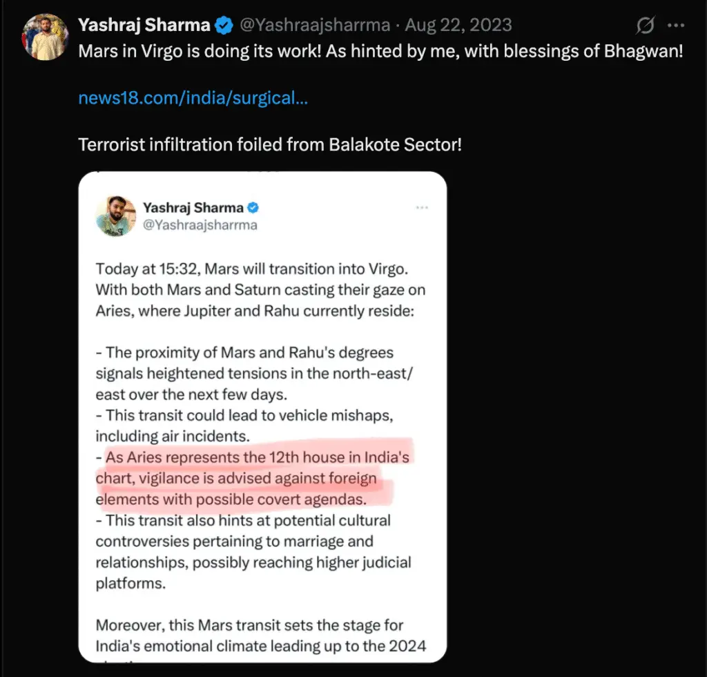 Predicted a significant failed terrorist infiltration in the Balakote sector. Here are the post links: Post 1 and Post 2.